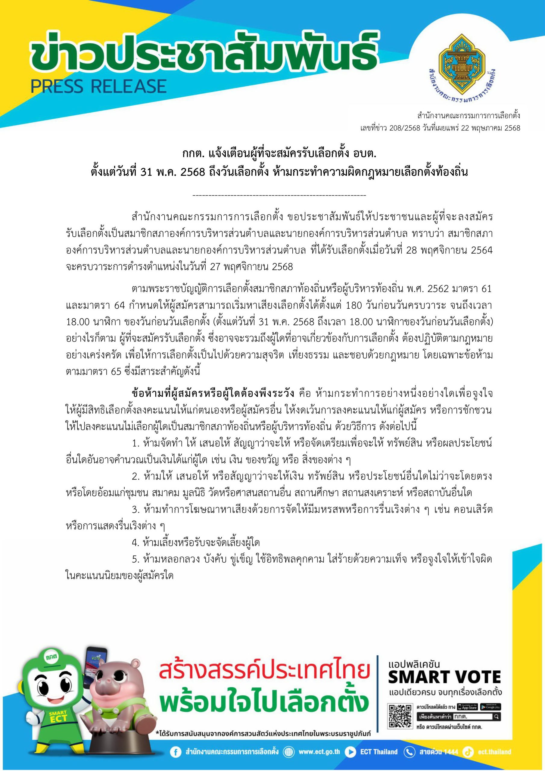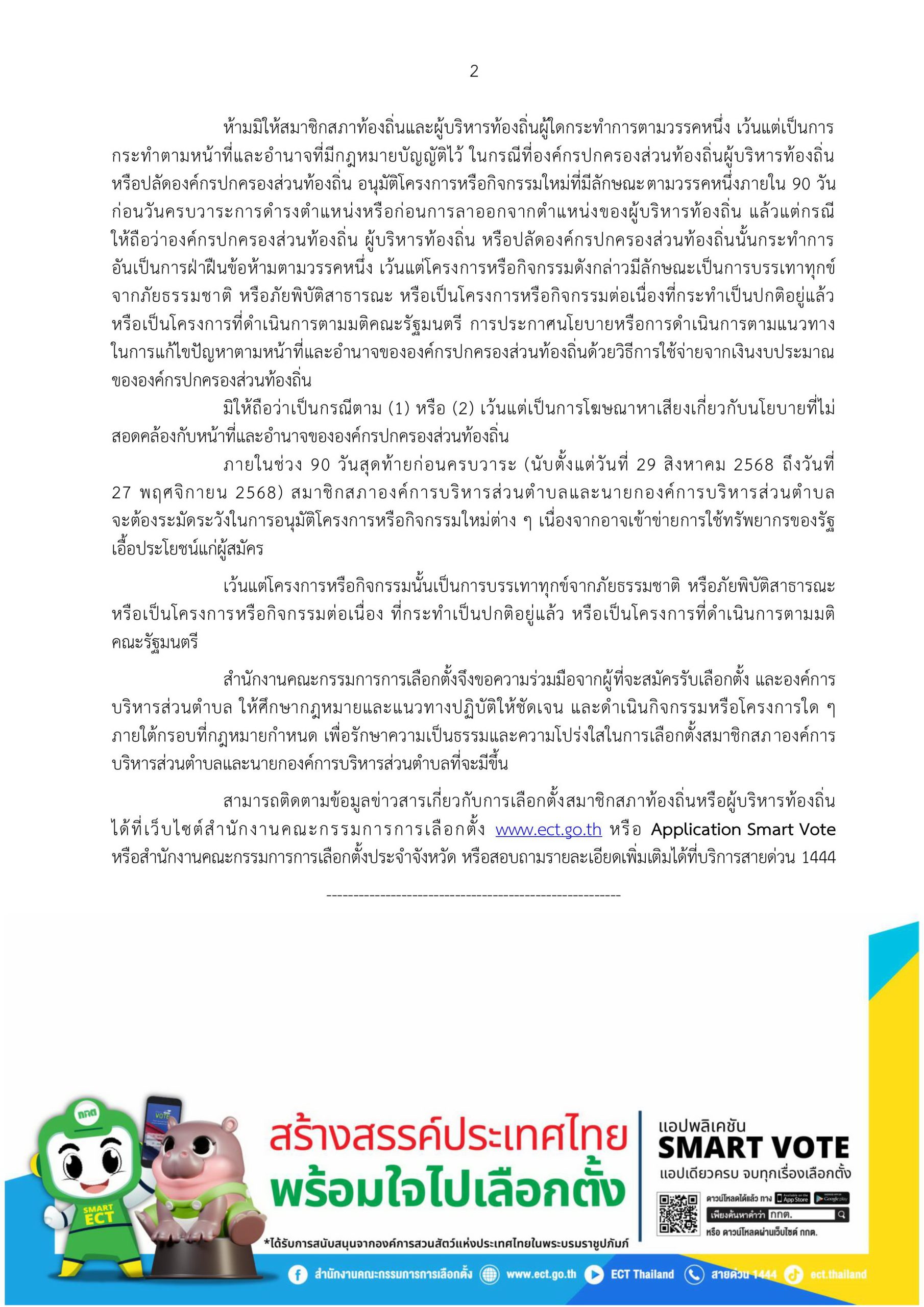 ข่าวประชาสัมพันธ์ คณะกรรมการการเลือกตั้ง (กกต.) แจ้งเตือนผู้ที่จะสมัครรับเลือกตั้งเป็นสมาชิกสภาองค์การบริหารส่วนตำบลและนายกองค์การบริหารส่วนตำบล 23 พ.ค. 68 แชร์