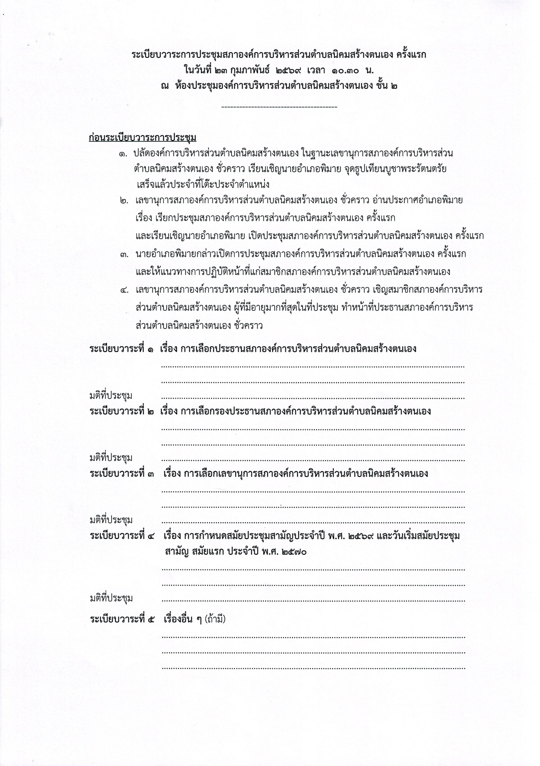 นายอำเภอพิมาย เรียกประชุมสภาองค์การบริหารส่วนตำบลนิคมสร้างตนเอง ครั้งแรก ในวันจันทร์ที่ ๒๓ กุมภาพันธ์ ๒๕๖๙ เวลา ๑๐.๓๐ น. ณ ห้องประชุมสภาองค์การบริหารส่วนตำบลนิคมสร้างตนเอง ชั้น ๒